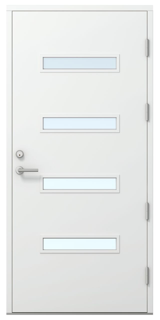 Ovilevy | EPS-lämpöeristetty 86 mm vahva ovilehti. Ovilevyn reunalla liimapuun ja kertopuun yhdistelmä sekä molemmat oven pinnat on alumiinilevyin vahvistettu. Oven pinta säänkestävä HDF-pinta valkoinen NCS S 0502-Y. Ulko- ja sisäpuolelta sileä.